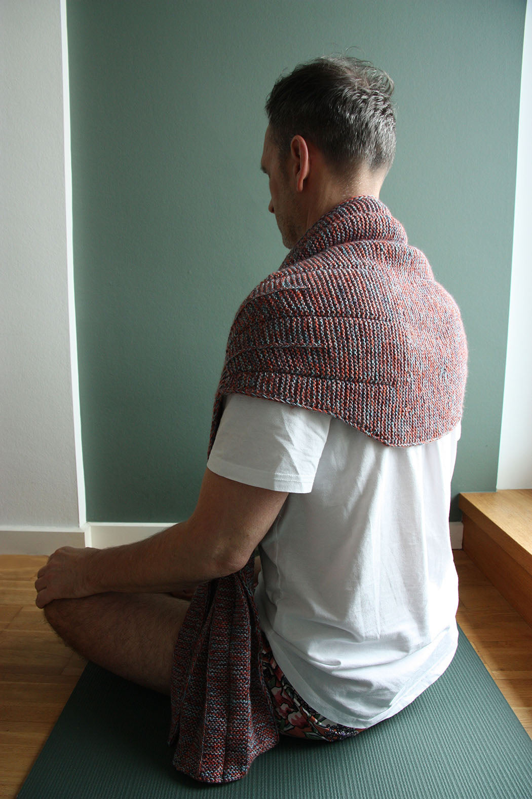Die ungewöhnliche Form des Immersion Wrap ist die Antwort auf den Wunsch nach einer Meditationsdecke, die auch bei langem Sitzen nicht von den Schultern rutscht. Eine weitere Anforderung an das Design war, dass es auch unterwegs getragen werden kann – damit weniger in die Yogatasche gepackt werden muss.