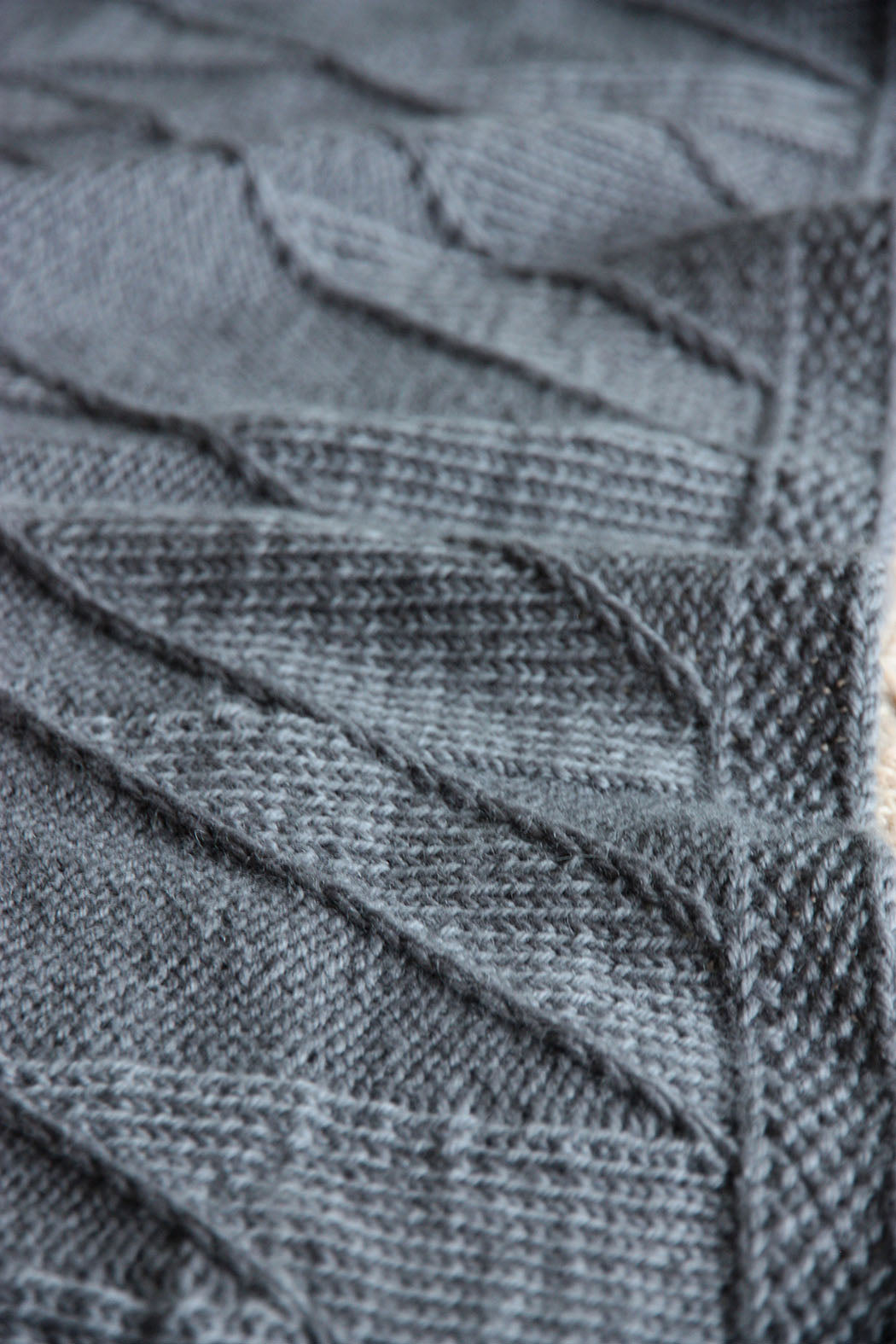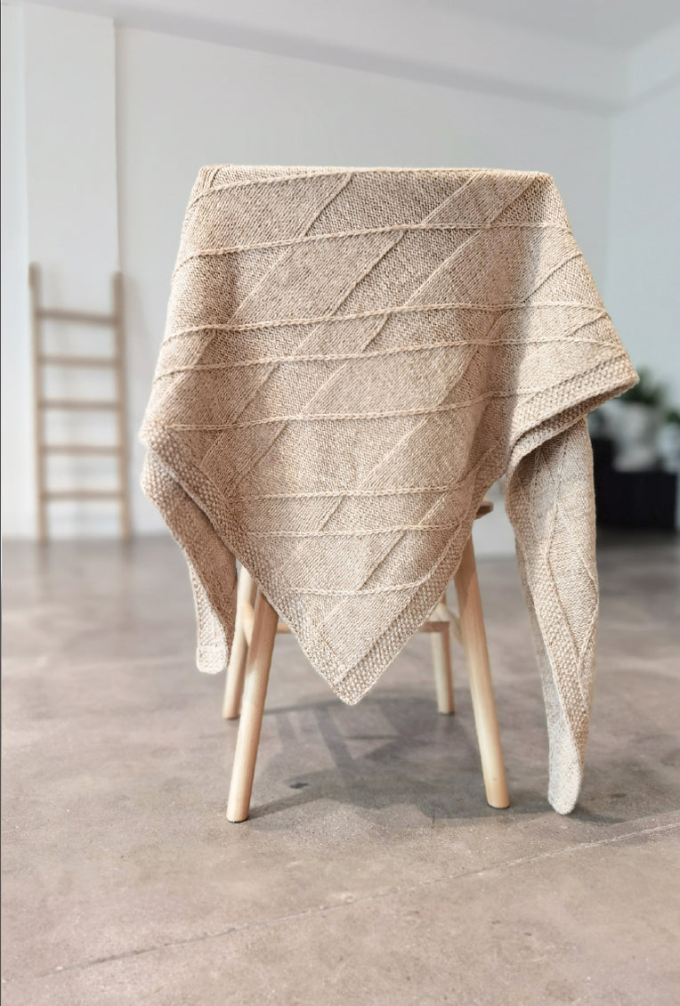 Das Tuch wird hauptsächlich glatt rechts/links gestrickt. Die kreuzenden Diagonalen werden in verzopften Hebemaschen gearbeitet.